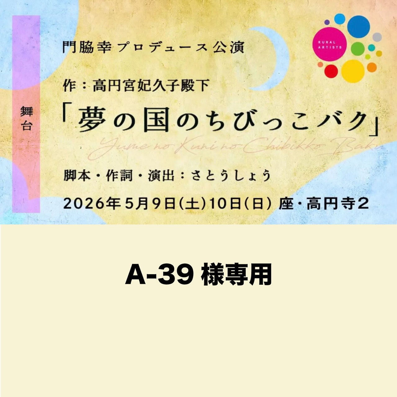 A-39様専用 5月9日(土)太陽組 18:00 歌と舞踊とお芝居の和舞台 「夢の国のちびっこバク」A席 8,500円1枚