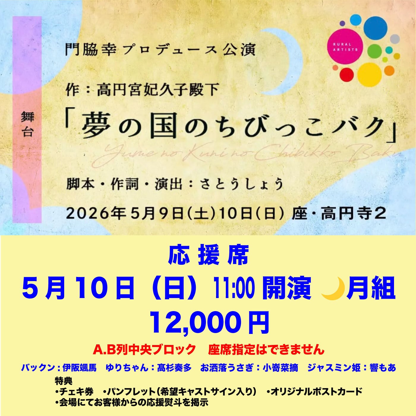 5月10日(日)11:00開演 月組 歌と舞踊とお芝居の和舞台 「夢の国のちびっこバク」 応援席 12,000円