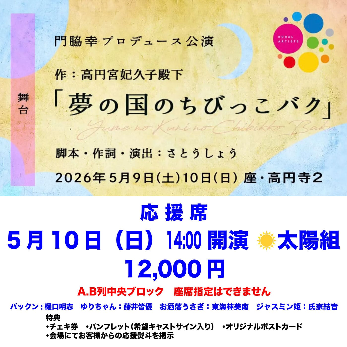 5月10日(日)14:00開演 ☀️太陽組 歌と舞踊とお芝居の和舞台 「夢の国のちびっこバク」 応援席 12,000円