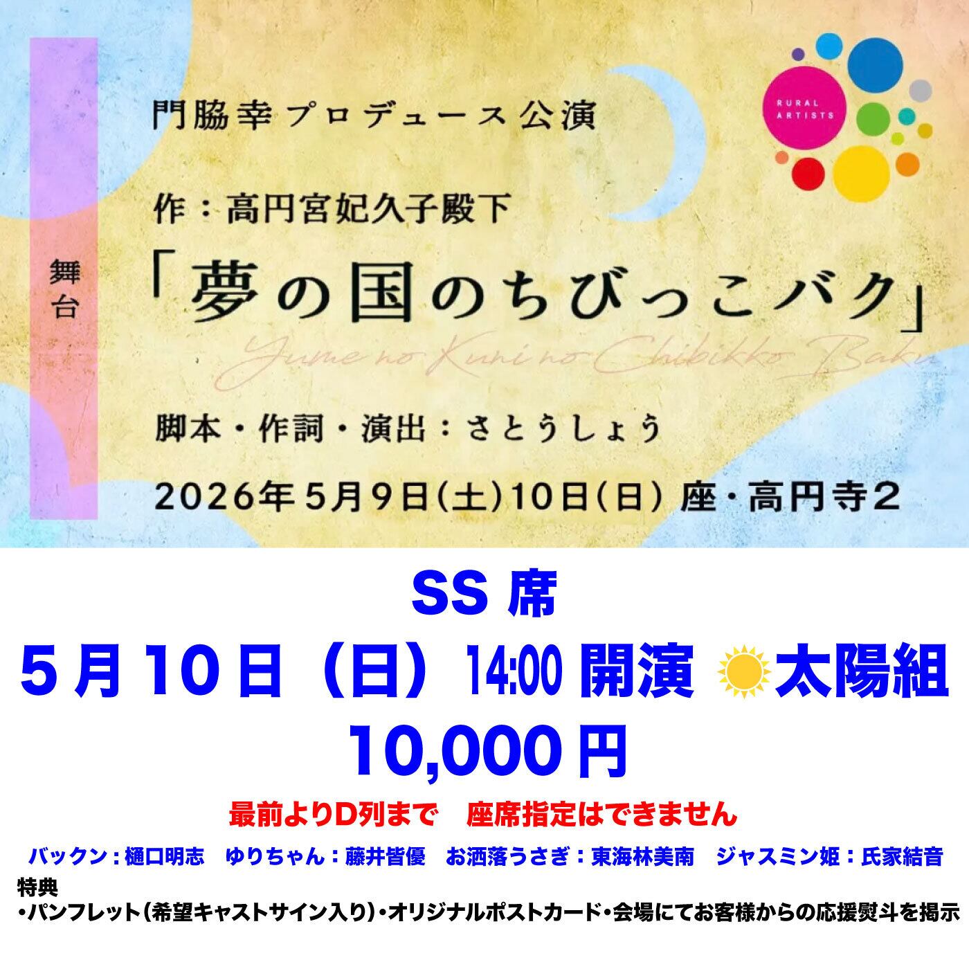 5月10日(日)14:00開演 ☀️太陽組 歌と舞踊とお芝居の和舞台 「夢の国のちびっこバク」 SS席 10,000円