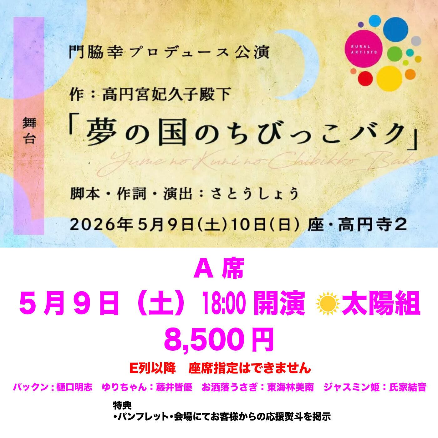 5月9日(土)18:00開演 ☀️太陽組 歌と舞踊とお芝居の和舞台 「夢の国のちびっこバク」 A席 8,500円